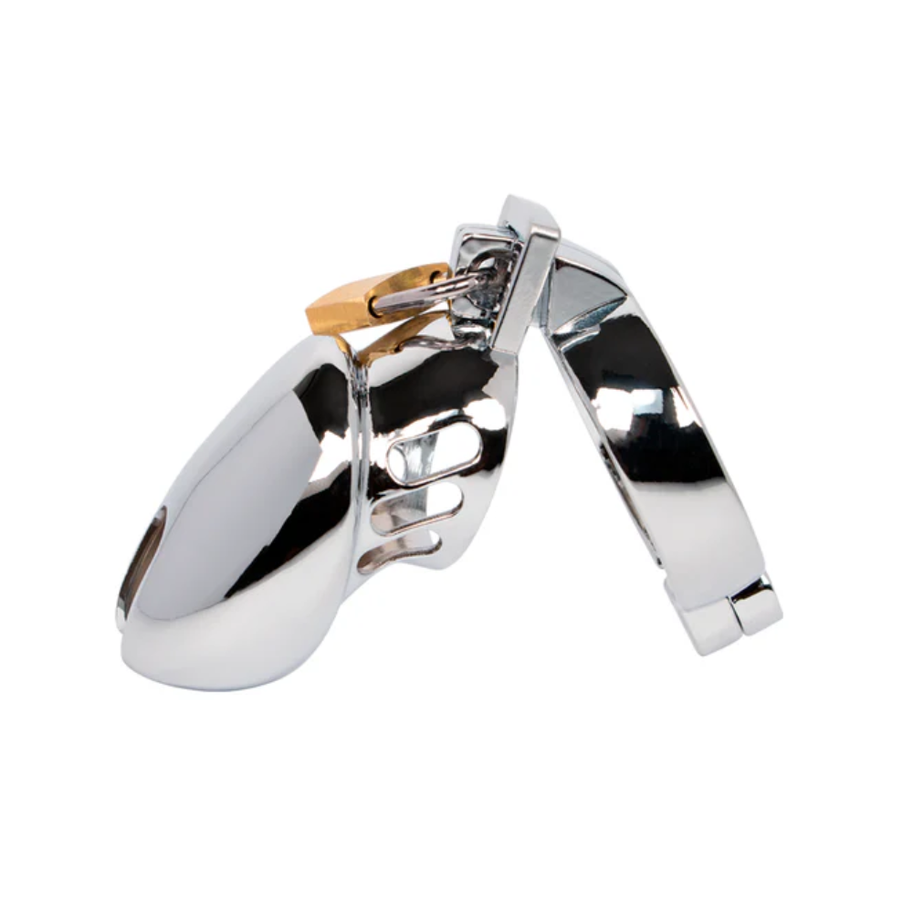 Esta jaula de castidad de acero inoxidable está diseñada para quienes disfrutan del dominio total y la sumisión sin concesiones. Su diseño cerrado impide cualquier tipo de estimulación visual o táctil, manteniendo el pene completamente inmovilizado. El acabado pulido brinda un toque elegante, frío y firme, ideal para juegos de castidad prolongados o sesiones BDSM intensas.