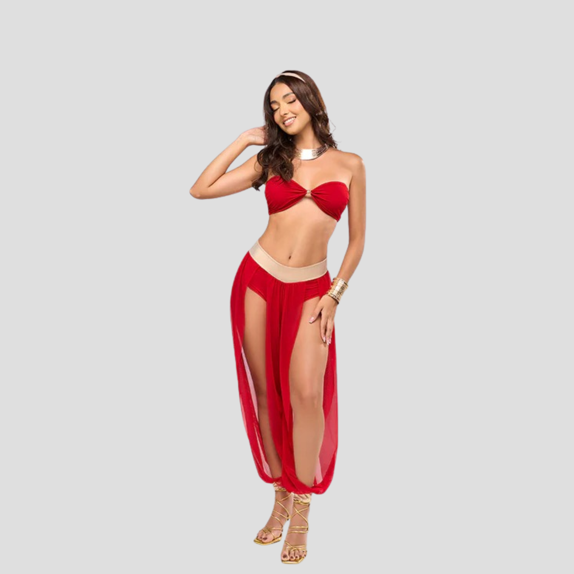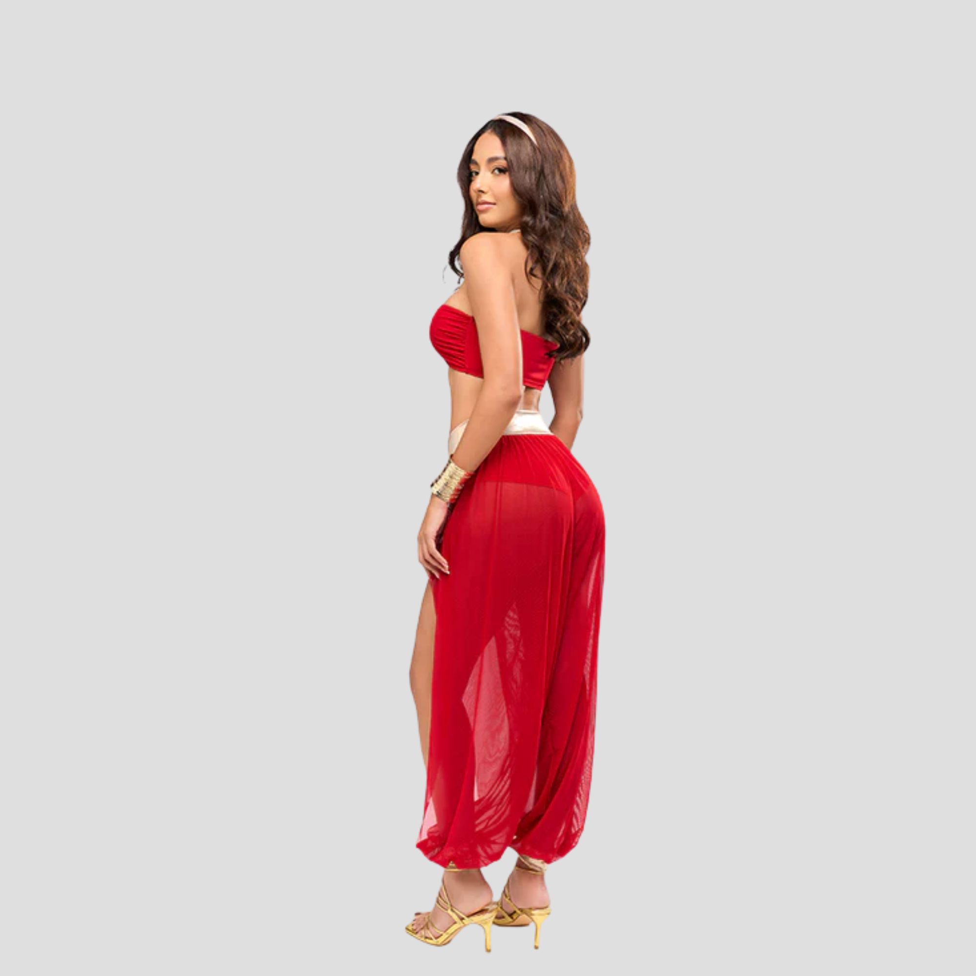 Sumérgete en un mundo de misterio y seducción con este hermoso disfraz Arabian Nights. Diseñado para quienes quieren destacar con elegancia y atrevimiento, este conjunto mezcla telas ligeras, cortes estratégicos y detalles que capturan la esencia exótica del Oriente fantástico.