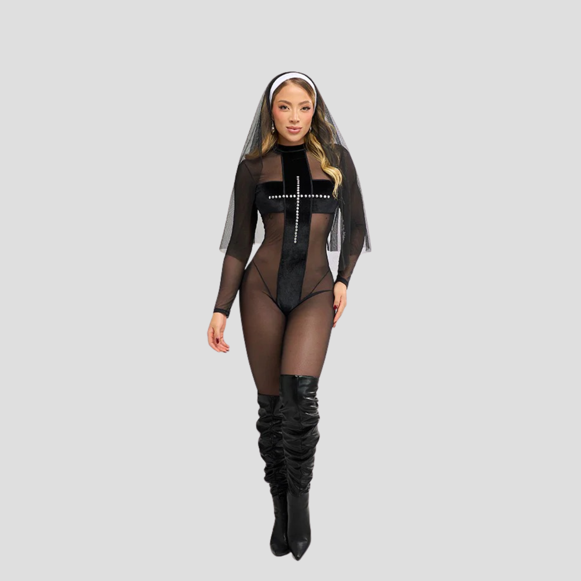 Transforma tu look con este sensual disfraz Holy Sinner. Incluye body negro con transparencias y detalles en vinilo, y capa de tul con velo para un contraste dramático.
